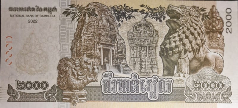 W prawym dolnym rogu banknotu jego nominał 2000. W okolicach środka banknotu, czarną czcionką seria i jej numer, powtórzony czerwoną czcionka w prawym górnym rogu. W lewym górnym rogu herb Kambodży