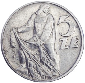 5 złotych Rybak 1973 r. - obiegowa moneta PRL, producent Mennica Polska S.A., metal aluminium, stempel zwykły, stan zachowania -2
