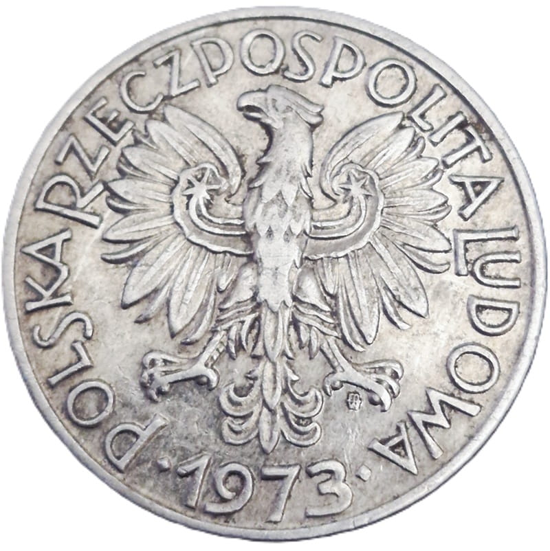 Na awersie w centrum widnieje orzeł bez korony ustanowiony dla godła Polskiej Rzeczpospolitej Ludowej. W otoku monety przy jej rancie napis dużymi literami: Polska Rzeczpospolita Ludowa oraz rok emisji monety 1973 na dole przy rancie oddzielony od napisu na początku i na końcu rąbami. Pod lewą łapą orła znak mennicy: m/w. Nad prawą łapą orła znak W, nad lewą łapą znak J