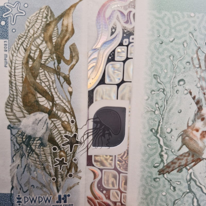 Opis cech banknotu: przeźroczyste pole, farba fluoroscencyjna oraz perłowa