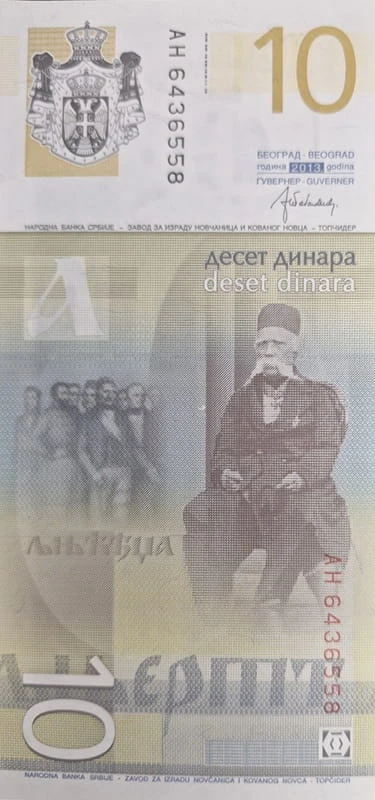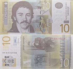 Grafika w układzie pionowym. U góry po lewej stronie godło państwa Serbii. Po prawej stronie nominał 10, a po środku seria i jej numer w zapisie pionowym. Poniżej u dołu grafika z wizerunkiem siedzącego mężczyzny, nominał oraz po prawej stronie u dołu pionowo czerwona czcionka seria i jej numer.
