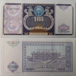 Na środku banknotu jego nominał 100, nad nim godło Uzbekistanu. U dołu banknotu dwa razy jego nominał 100. U góry banknotu po lewej stronie oraz po prawej stronie u dołu czarną czcionką seria i jej numer. Na białym tle po prawej stronie nominał banknotu wśród ornamentu nad nim rok emisji 1994