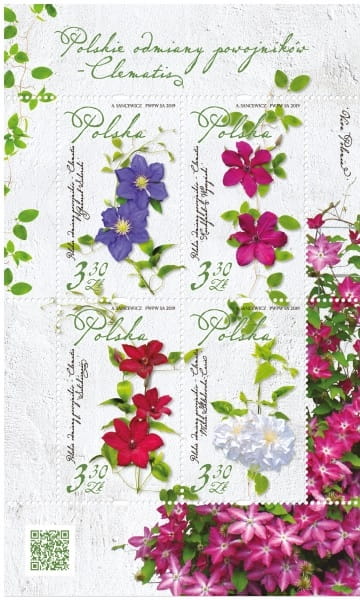Polskie Odmiany Powojników 2019 r. - arkusz znaczków kolekcjonerskich o ograniczonym nakładzie pojedynczego znaczka 120 000 sztuk, emitent Poczta Polska, projektant Agnieszka Sancewicz, stan zachowania nowy
