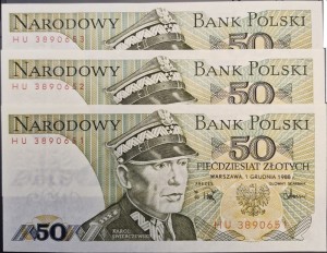 Banknoty 50 zł Świerczewski UNC 1988 3 kolejne nr1