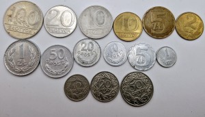 Zestaw obiegowe monety PRL głównie lat 70 i 80-tych + 10, 20 i 50 gr 1923 oraz 1 gr 1949 r. oraz W zestawie 1 grosz 10 groszy, 20 groszy, 50 gorszy oraz 1 złoty, 2 złote, 5 złotych, 10 złotych, 20 złotych oraz 100 złotych. Stan zachowania monety pochodzą z obiegu. Monety wykonane m.in. z Aluminium (Al) 1 gr, 5 gr, 10 gr, 20 gr, 50 gr i 1 zł oraz małe 2 i 5 złotych, z Mosiądzu (M) 2 zł i 5 zł oraz z Miedzioniklu (MN) 10 zł i 20 zł. Wokół rantu napis dużymi literami: Polska Rzeczpospolita Ludowa, centralnie na awersie orzeł bez korony, a między szponami lewej łapy znak mennicy: M/W