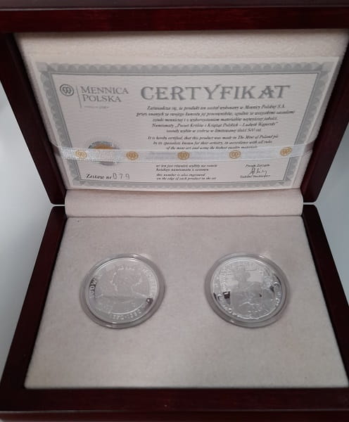 Ludwik Węgierski zestaw półpostać i popiersie - srebrne numizmaty kolekcjonerskie w drewnianym pudełku z serii Poczet królów i książąt Polskich jako uzupełnienie serii monet 10 złotych. Stan zachowania numizmatów menniczy z certyfikatem