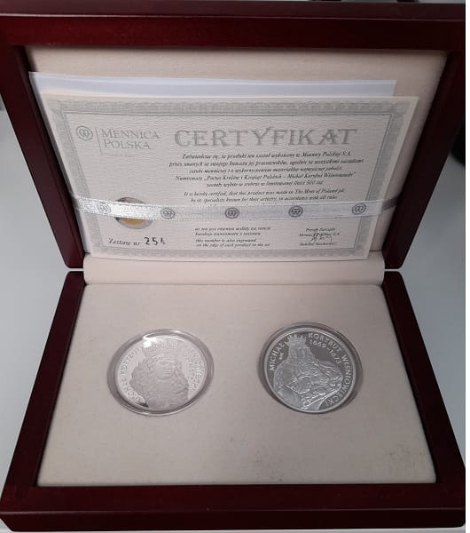 Michał Korybut Wiśniowiecki zestaw półpostać i popiersie - srebrne numizmaty kolekcjonerskie w drewnianym pudełku z serii Poczet królów i książąt Polskich jako uzupełnienie serii monet 10 złotych. Stan zachowania numizmatów menniczy z certyfikatem