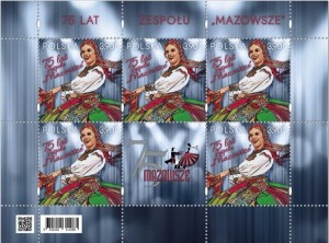 Arkusz 75 lat zespół Mazowsze 2023 r. - arkusz znaczków kolekcjonerskich projektu Rocha Stefaniaka o ograniczonym nakładzie pojedynczego znaczka 135 000 sztuk, emitent Poczta Polska, stan zachowania nowy