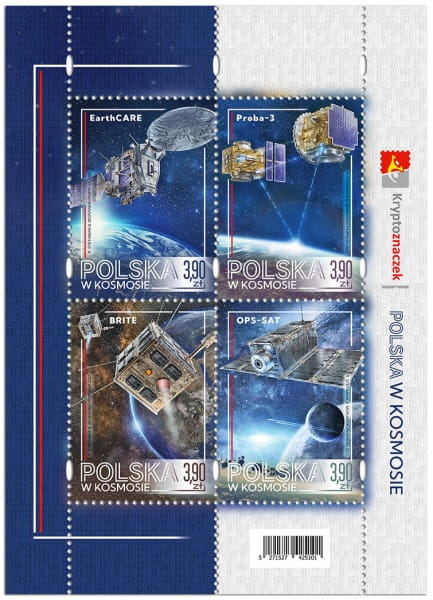 Na znaczku: Na znaczkach przedstawiono EarthCARE - która jest misją obserwacji ziemi, misję BRITE, misję Proba-3 oraz na czwartym znaczku została przedstawiona misja OPS-SAT